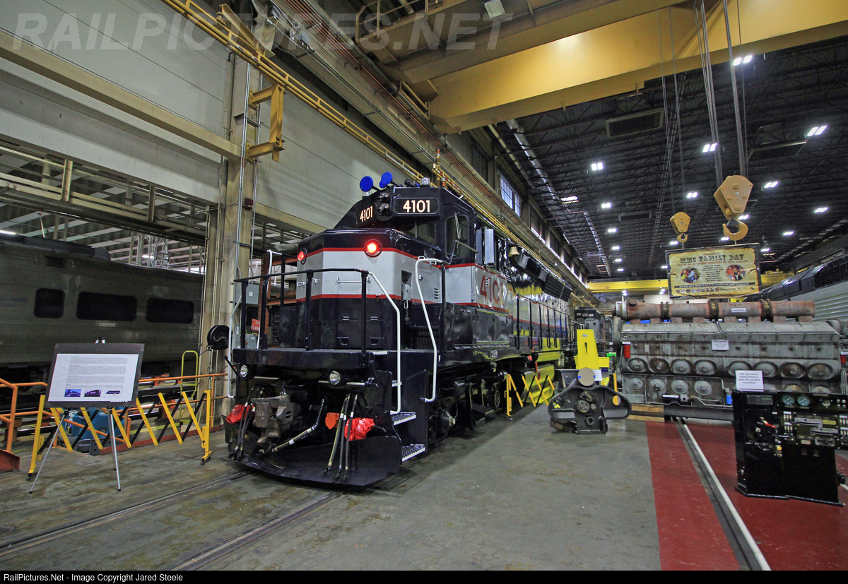 | The newest member of the NJT heritage fleet, GP40PH-2 #4101 sits on display inside the MMC for "Family Day 2022". The Geep sports a classy coat of original DOT blue and grey. |