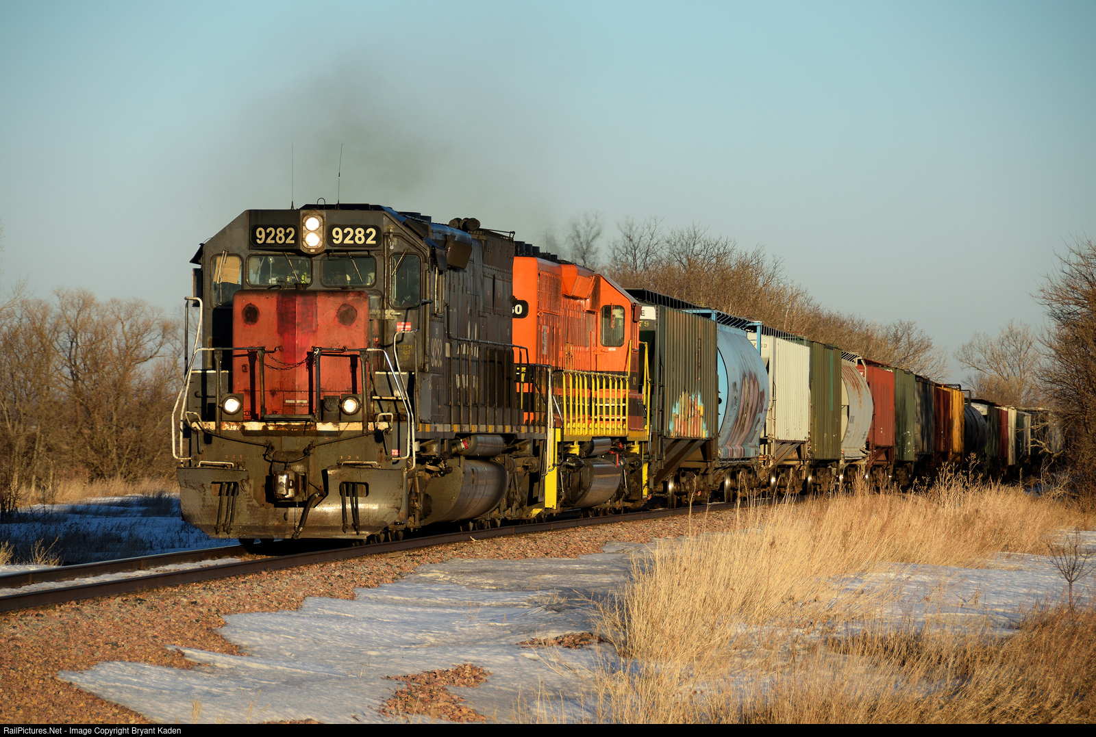 The Rapid City, Pierre & Eastern operated a handful of LTEX tunnel motors for a while in 2021, including the 9282 still wearing the paint scheme of its original owner, Southern Pacific. The venerable locomotive is seen climbing one last hill on its way west toward Tracy, MN on a clear March evening.