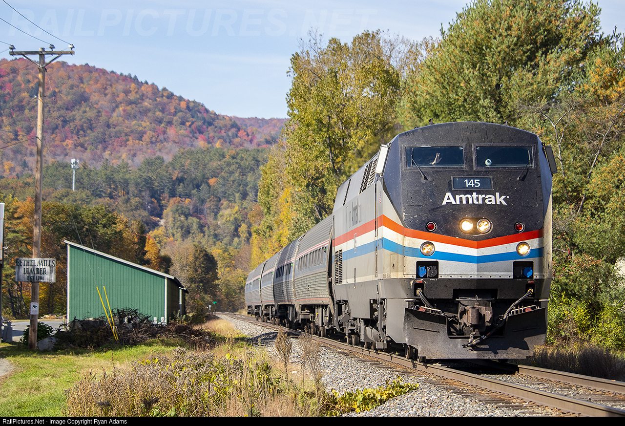 | Amtrak 145 once again has the honor of leading the southbound Vermonter through the small town of Bethel, VT. With a wave to the MOW crews on the other side of the tacks, the 10-minute late train races south along the White River. |