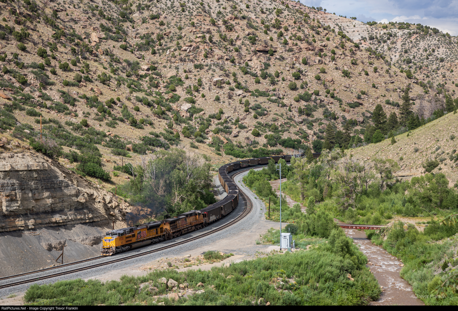 | Coal loads howl up the grade through the Price River Canyon with the front end power, four pack of manned helpers, and rear DPU giving it all they've got restricted to 10mph in a grand spectacle of sound and power. Climbing the strenuous grade towards Soldier Summit, they'll be able to handle 30mph just west of here as the ascent relents a bit. |