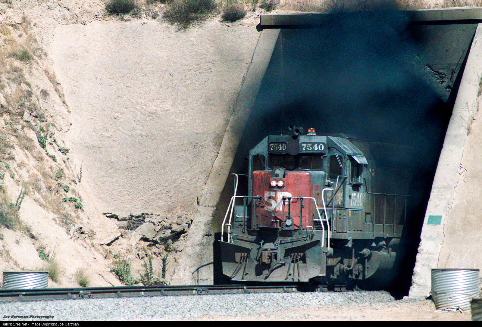 SP 7540 emerges from Tunnel 3, between Bealville and Cliff with a cloud of soot rich smoke following close behind.