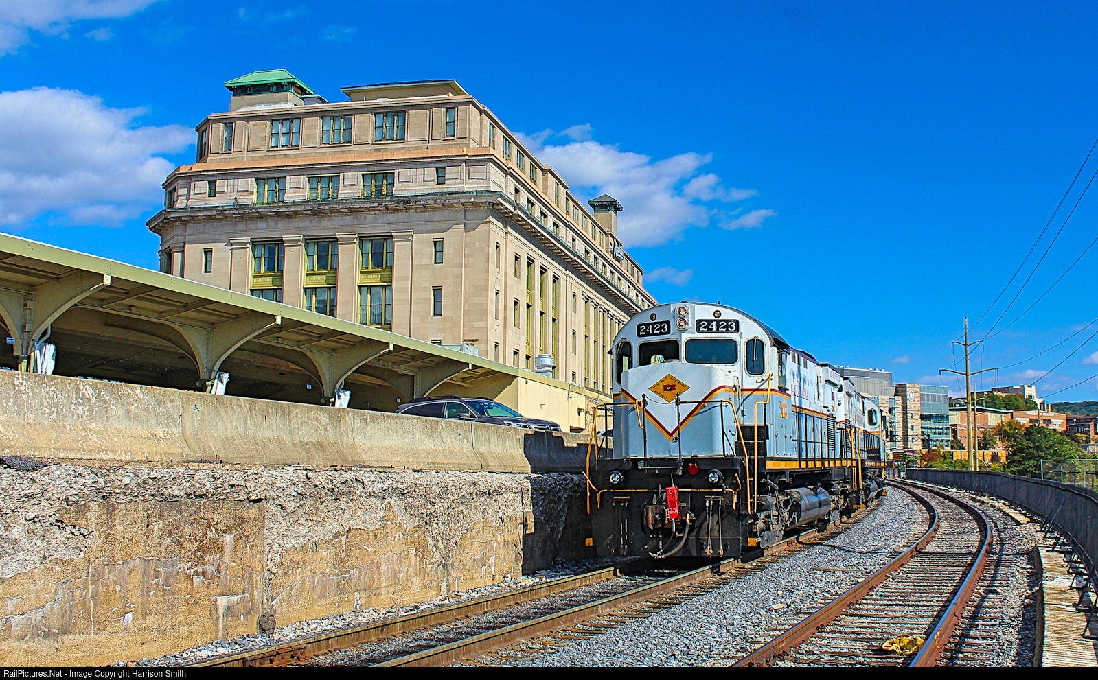 | PO-75 Past the Raddison: A rare Sunday run down the Pocono Main resulted in Delaware-Lackawanna PO-75 passing the Raddison Hotel, former Lackawanna Station on their way back into Steamtown Yard. A nice corporate lashup was present, something that's slowly becoming easier to spot on the GVT system. |