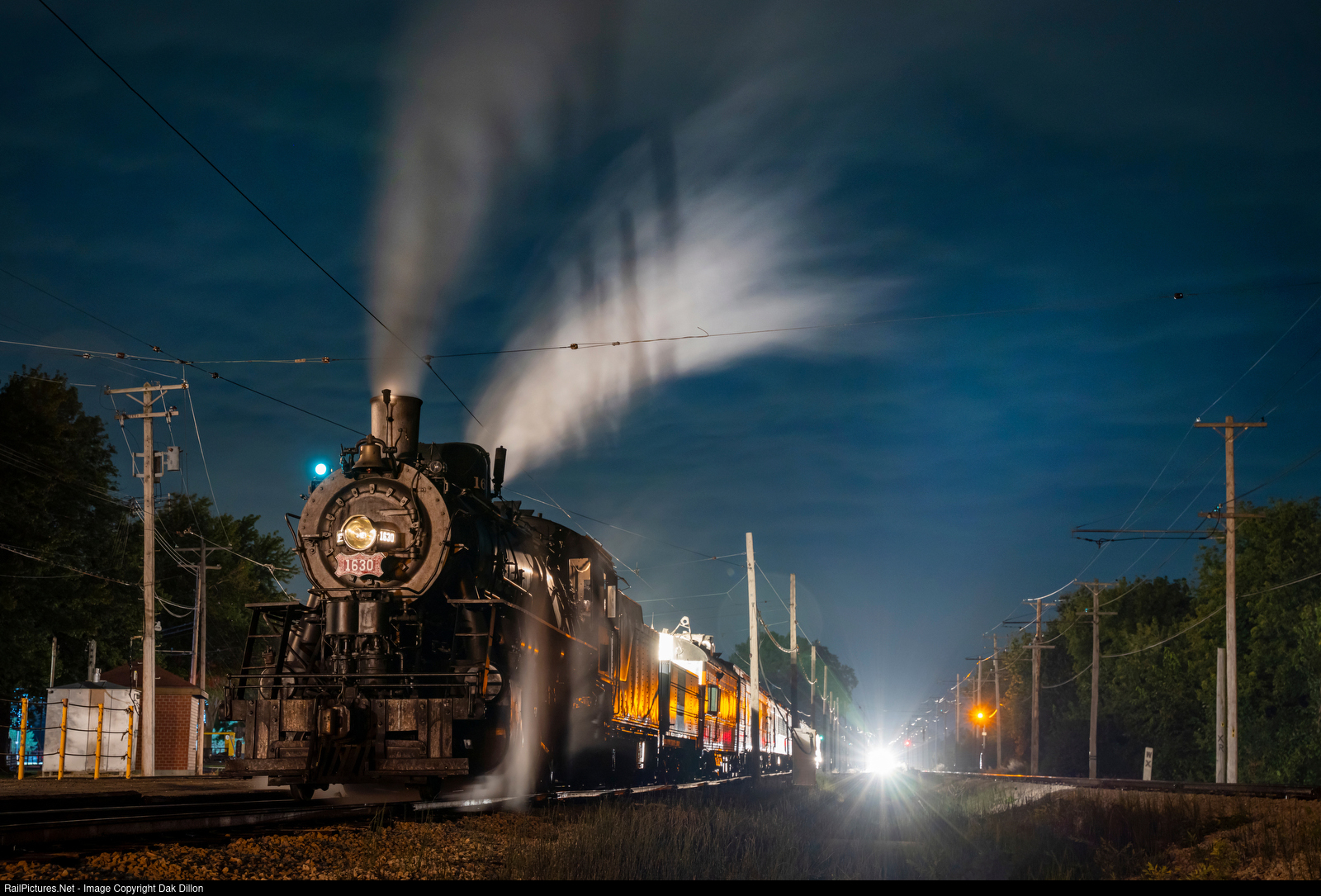 Illinois Railway Museum’s Frisco 1630 waits for the go ahead during the 2022 Museum Showcase Weekend. In the distance, the Nebraska Zephyr returns to the station, illuminating the scene.