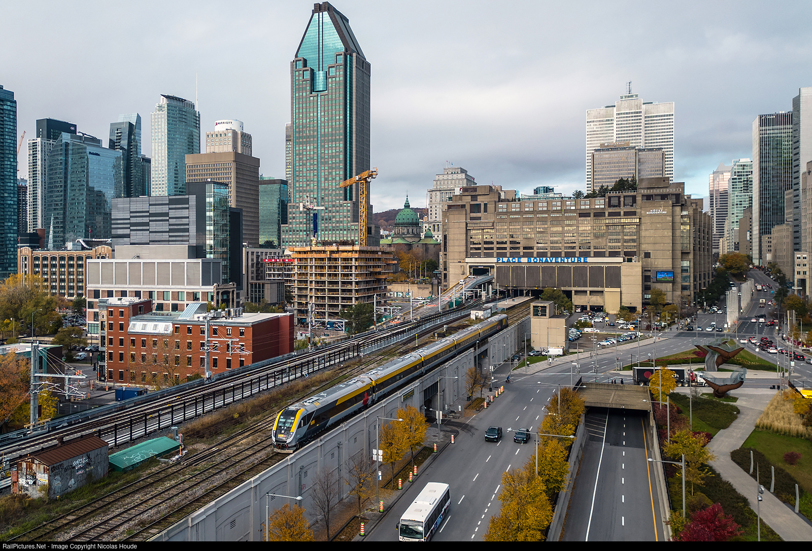 | After departing Montreal's Central Station, VIA 627 is passing the skyline of downtown with cab-car SIIX 2301 leading. VIA 627 is a special train running from Montreal to Ottawa with VIA employees on board in order to test the train. This equipment will be back later on the same day as VIA 628. |