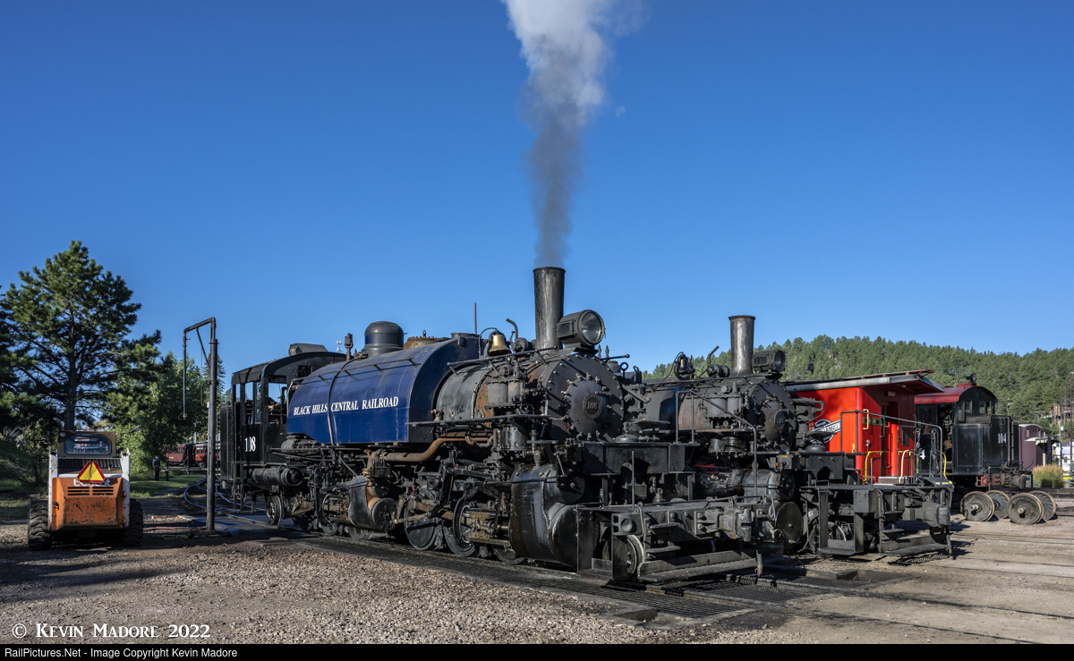 Seeing double. Yes indeed, there are two, big, Baldwin 2-6-6-2T, articulated, compound mallet locomotives steaming in the yard at Hill City, SD this morning. The duty engine for the first two regular trains will be Locomotive #108, seen in the foreground. Behind her, Locomotive #110 is hot from the previous day, but has yet to be fired up. Before heading off to pick up her train, #108 will shortly back up and couple on to the 110, to move her to the pit track, where her fire will be re-ignited and her pressure brought up to full operating level. Later today, both the 108 and the 110 will join forces to pull a double-headed passenger train to celebrate the 65th birthday of the Black Hills Central Railroad.