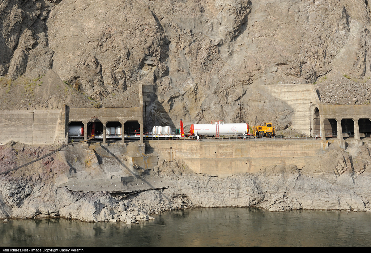 | A year after the fire in Lytton, understandably everyone is a little on edge with the dozens of fires in the Cascades mountains on both sides of the border. Canadian National has a fire train known as Poseidon, with specially painted and reporting marked tank cars CNFD 100001-100005. The bulkhead flatcar between the two tanks carries the pumps and retardant additives. The train is based in Kamloops and with a bit of dumb luck we got to see a trackmobile at track speed, they're very noisy in rock sheds. |