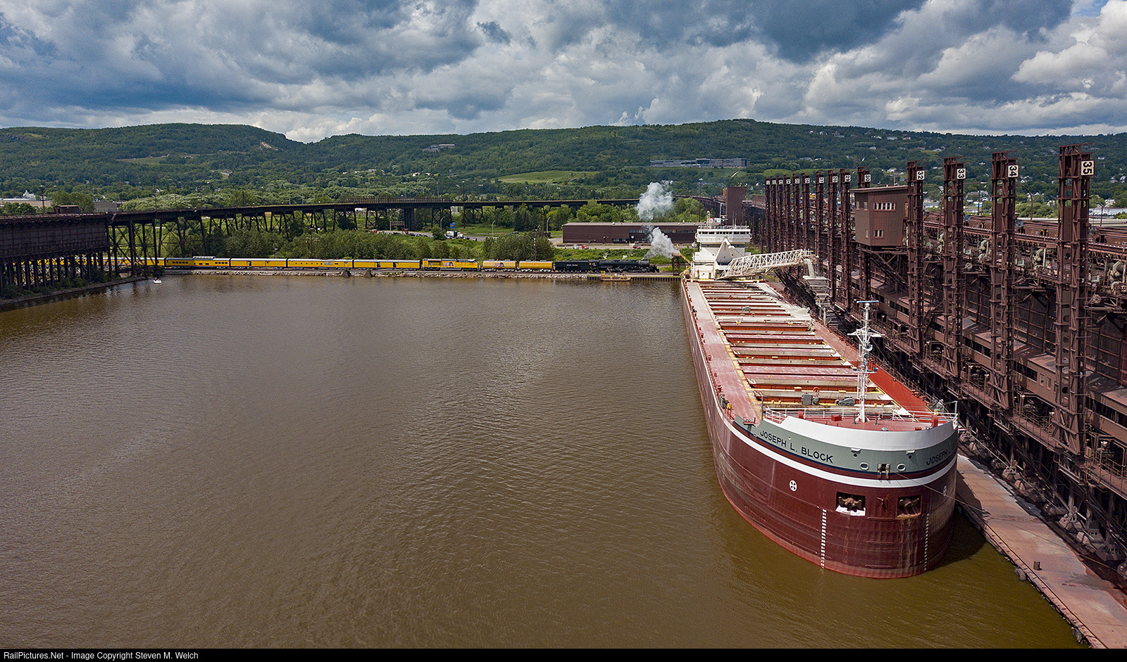 Union Pacific's "Big Boy" is dwarfed by the Joseph L. Block unloading Minorca-bound limestone at CN's Dock 6 in Duluth.