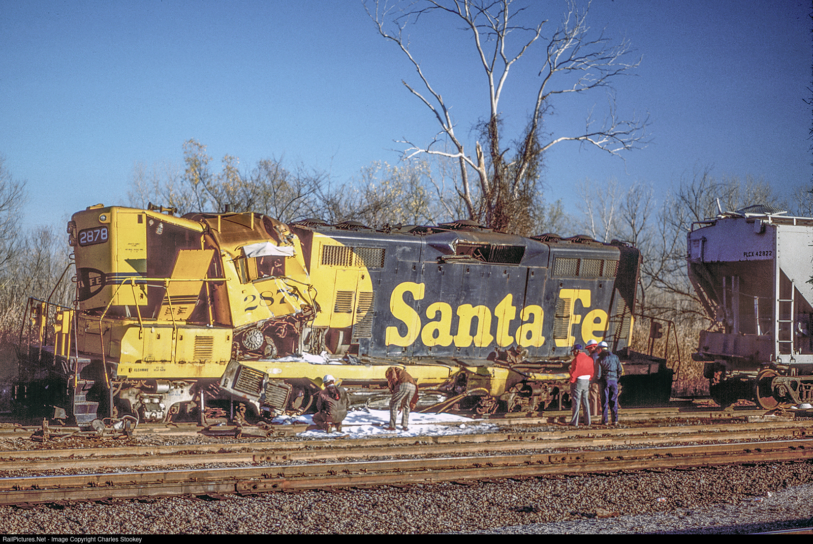 Santa Fe officials decided to switch the unit onto the a yard track in hopes it would derail. The plan worked to perfection and this is the result. I don't know if the covered hopper was already there or was positioned for the locomotive to derail into it but it did a good job of stopping the 2878 as it wallowed down the track. My photo.