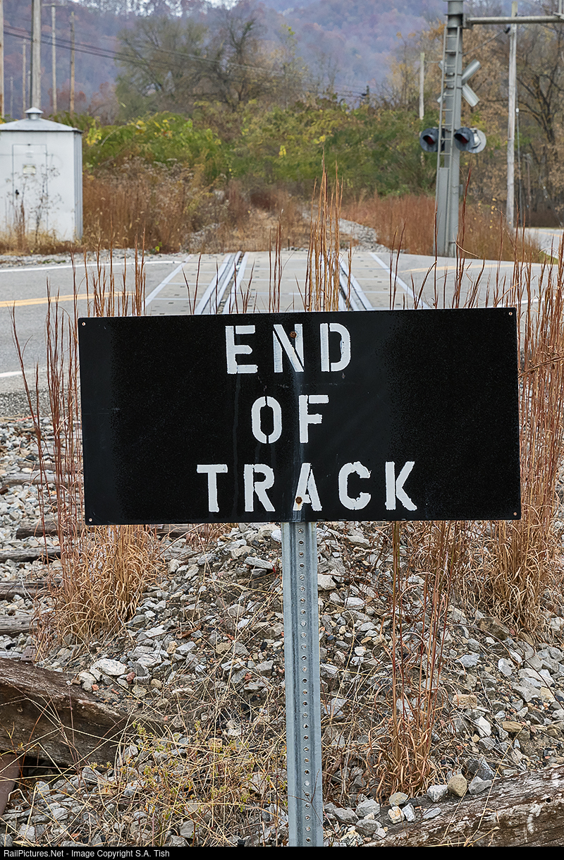 End of Track - the sign says it all! The once busy Alma Branch to the Sprouse Creek prep plant is now just a stub off the Pokey mainline and has been removed beyond the grade crossing ahead as nature quickly reclaims the old roadbed.
