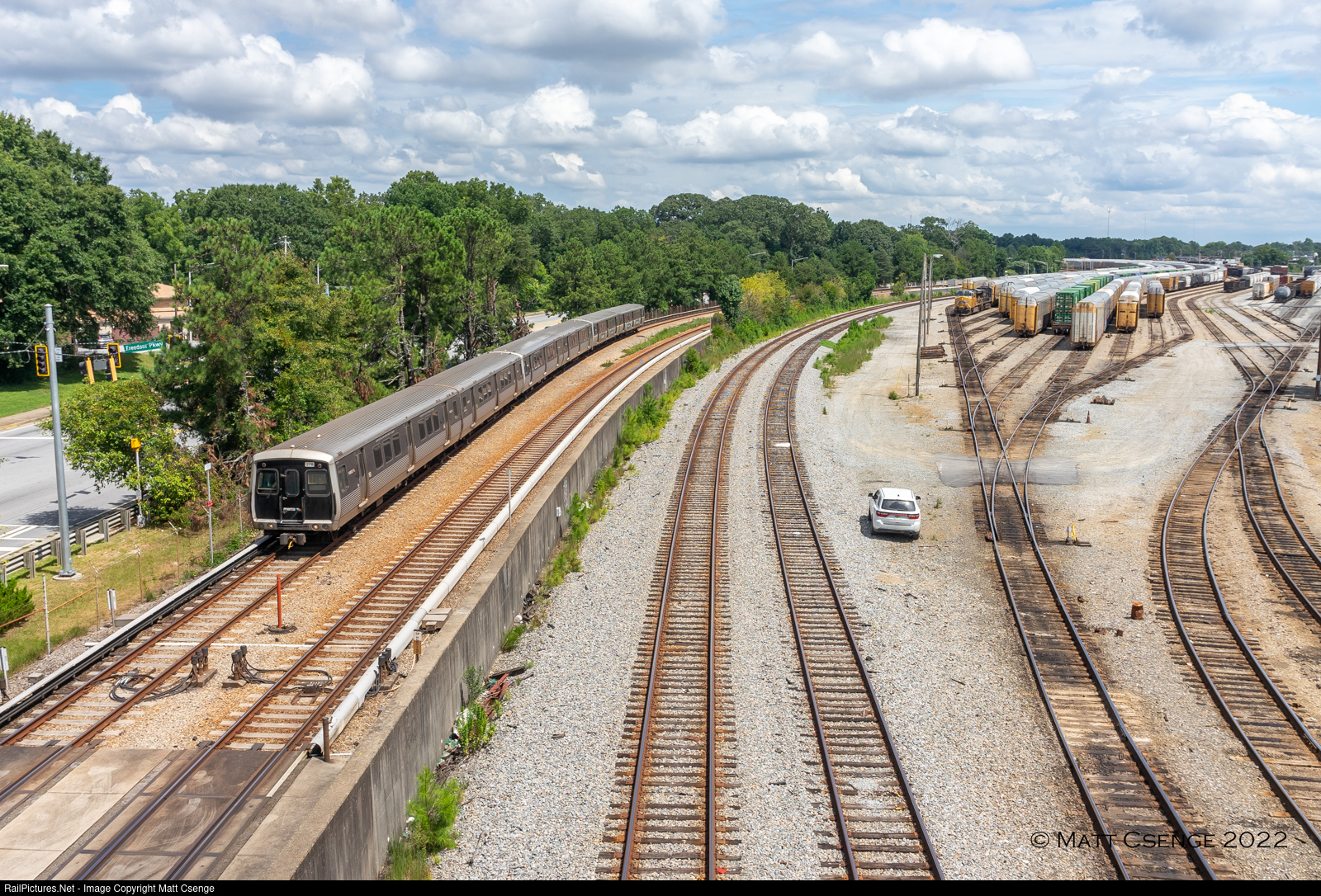 A southbound MARTA Red Line train of CQ311 cars (Hitachi, 1984-1988) is seen racing past Norfolk Southern's Industry Yard in East Point, GA. Outside of downtown Atlanta, the MARTA Rail lines generally follow established freight corridors, sharing the right-of-way with CSX and Norfolk Southern freight trains.