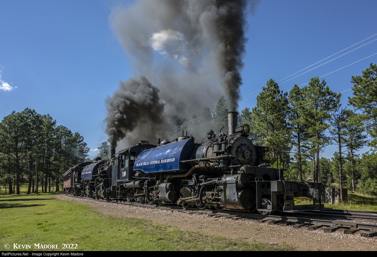Celebrating 65 years!. On August 20th of 2022, the Black Hills Central Railroad celebrated it's 65th anniversary as a tourist line, and did so in fine style by running a double-header, featuring both of their big Mallets. Although the Black Hills Central may be one of the least well-known steam tourist railroads in the country, it is, in fact one of the very oldest. As a tourist line, it is older than even the venerable Strasburg Rail Road in Pennsylvania. Established in 1957, the Black Hills Central ran narrow gauge equipment on dual-gauged track for a number of years, before migrating to an all standard gauge operation. They've also operated quite a number of locomotives over their history, most recently, this pair of big, Baldwin, 2-6-6-2T Mallet Saddle-Tankers. Our special anniversary train paused at the Oblivion Wye, near Mile Marker 4.4, allowing photographers with special VIP tickets to disembark. Three run-bys were then conducted, including this one, which featured excellent stack talk and a great smoke-show as the train climbed the steep grade past the wye.
