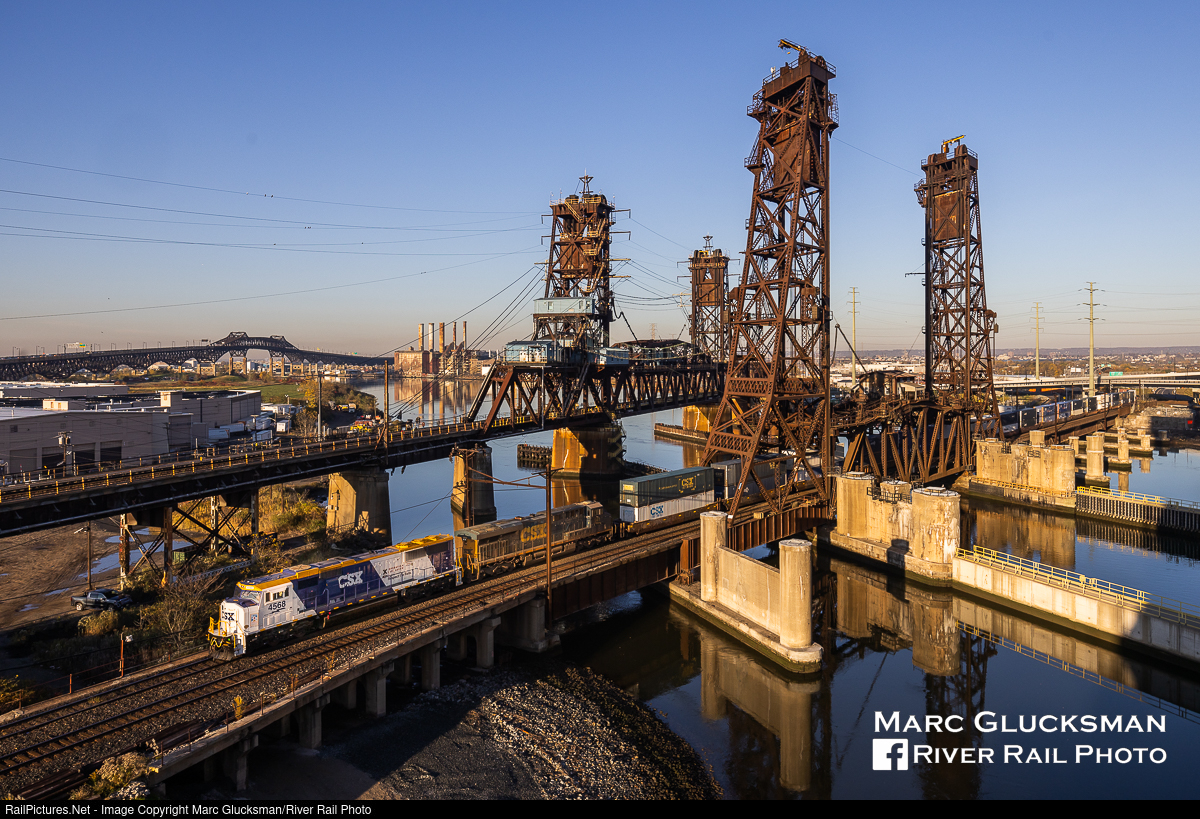 Morning At Hack. On November 3, 2022 CSX SD70MAC 4568 (née-CSXT 768, 3/2000) made one of its first trips leading a train on the River Sub while wearing its new special paint scheme to commemorate the 50th anniversary of Operation Lifesaver. As the train it was leading, CSX I157-02, doubled and departed South Kearny Yard, the sun was just high enough to illuminate the train as it crossed Hack Lift Bridge into Jersey City, New Jersey. The lift bridge in the background carries PATH trains, while the bridge in the far background is for U.S. Routes 1 & 9.