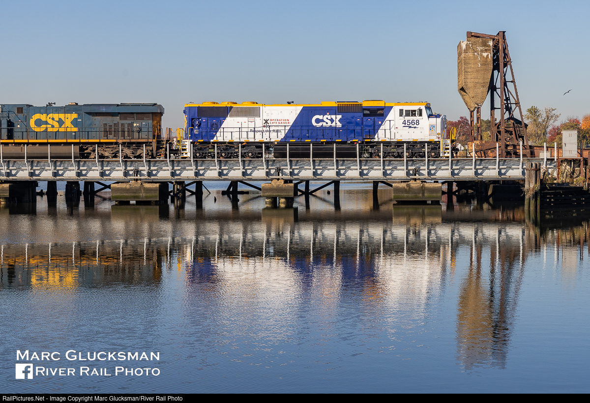 Over Overpeck. On November 3, 2022 CSX SD70MAC 4568 (née-CSXT 768, 3/2000) made one of its first trips leading a train on the River Sub while wearing its new special paint scheme to commemorate the 50th anniversary of Operation Lifesaver. A relatively calm Overpeck Creek yields a nice reflection as the train crosses into Ridgefield Park, New Jersey.
