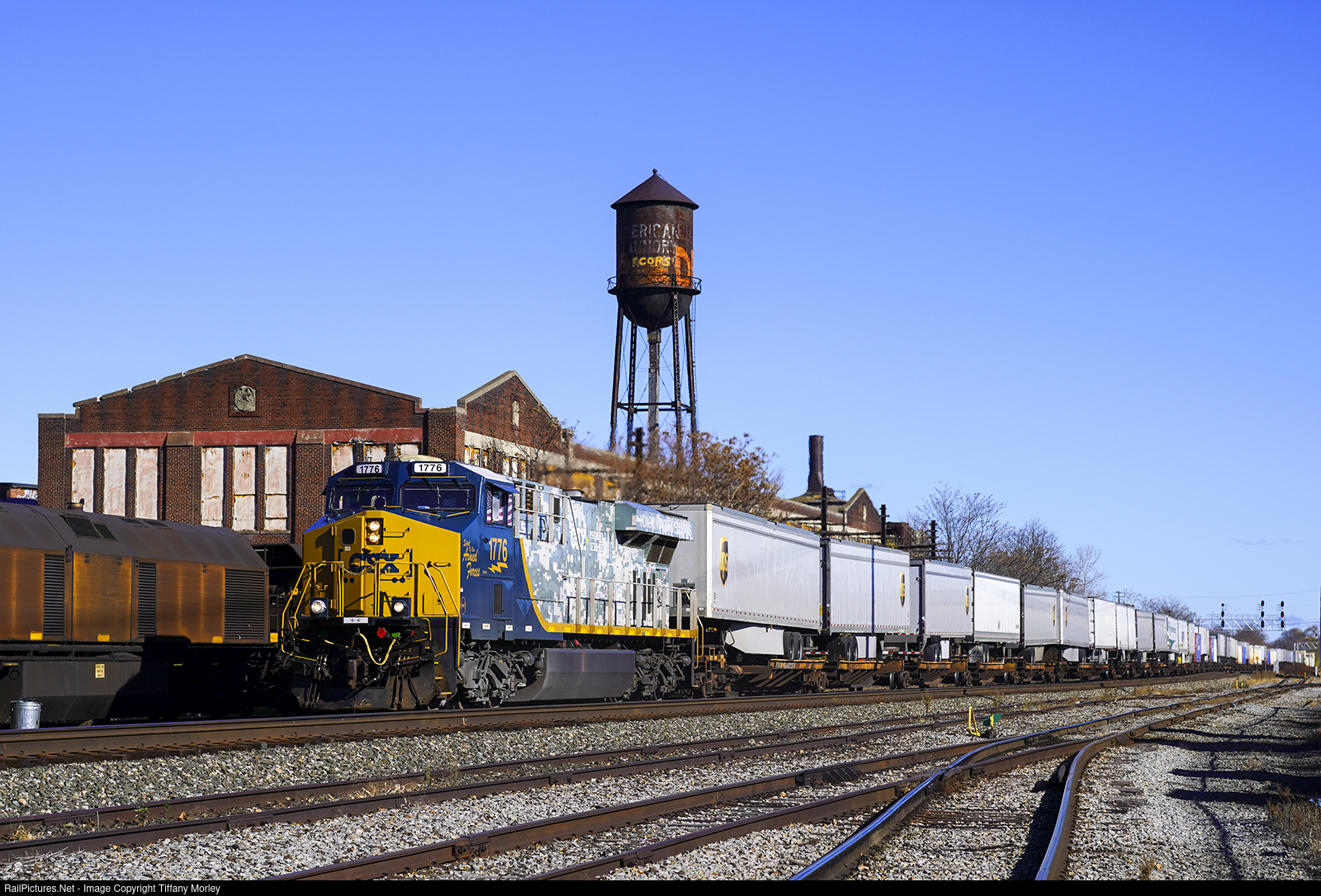 | The CSXT 1776 "Spirit of Our Armed Forces" leads CSX's hottest train by the American Laundry Machinery Company that manufactured commercial laundry, dry cleaning and textile processing machinery in Rochester, NY from approximately 1930-1960. |