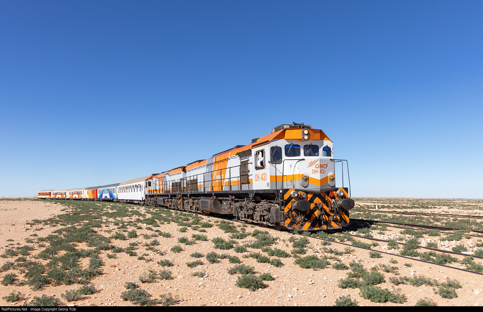 The ORIENTAL DESERT EXPRESS from Oujda to Bouarfa (305 kilometers) is in El Fouchal, about 25 kilometer south of Ain Beni Mathar, pulled by locomotives DH # 421 and # 430. The ONCF bought 30 of this NGT26CW-3WNFORCE from National Railway Equipment (NRE), built by TZV Gredelj in Zagreb/Croatia, between 2012 aind 2014. They have a remanufactured 16-645 E3 prime mover and a weight of 122 metric ton. This railway line was built between 1925 and 1931, and later prolonged south into Algeria.