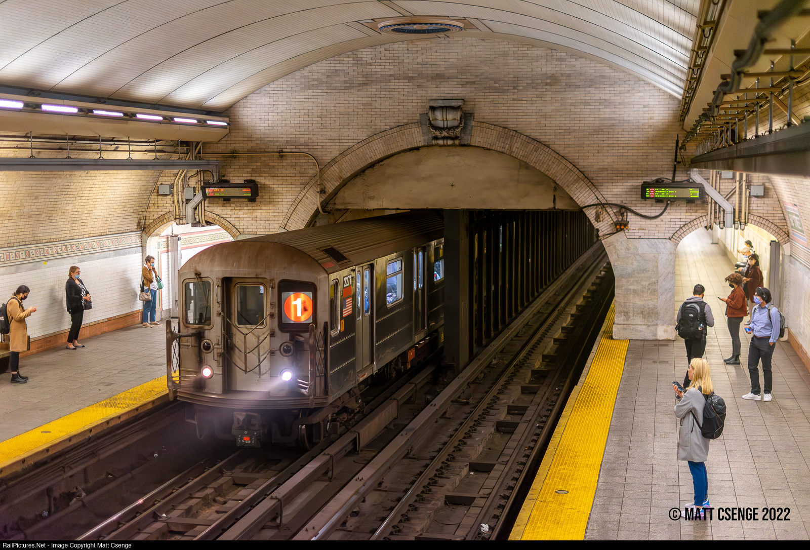 R62A car 2271 (Bombardier, 1984-1987) is seen leading a Bronx-bound 1 train into 168th St Station. The Broadway-7th Avenue Line at this point was built in a deep mined tunnel with large stations that have vaulted ceilings. The stations were only built for 5-car trains, however, and when stations throughout the IRT system were lengthened to handle 10-car trains, less-expensive construction was used and the vaulted ceilings were not continued. This had the fortuitous benefit of maintaining the architectural details on the station portal, which may or may not have been kept if the full station cross-section was extended.