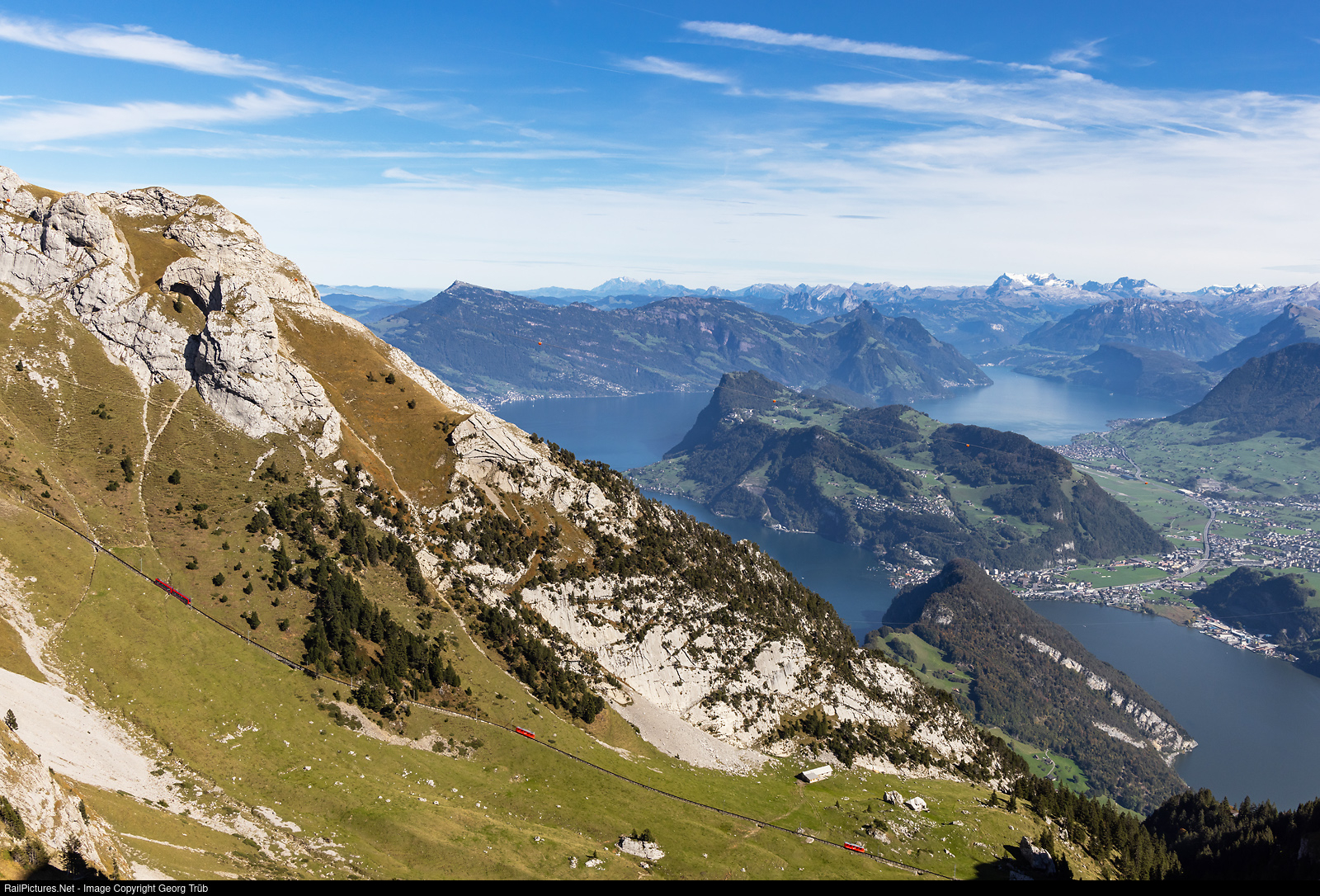 View from the Matthorn to the Mattalp, part of the Pilatus massif, Lake Lucerne (Vierwaldstättersee), the Rigi, the Bürgenstock an so on. As train CC 21 from Alpnachstad to the Pilatus Kulm are running up the new cogwheel railcars Bhe 2/2 # 43 and # 41 in multiple control, and two railcars of the series Bhe 1/2 # 31... on sight distance. Above the Rigi mountain is the Säntis in the eastern part of Switzerland, more right with snow/ice the Glärnisch massif. On the right lower corner is the Alpnachersee, part of Lake Lucerne.