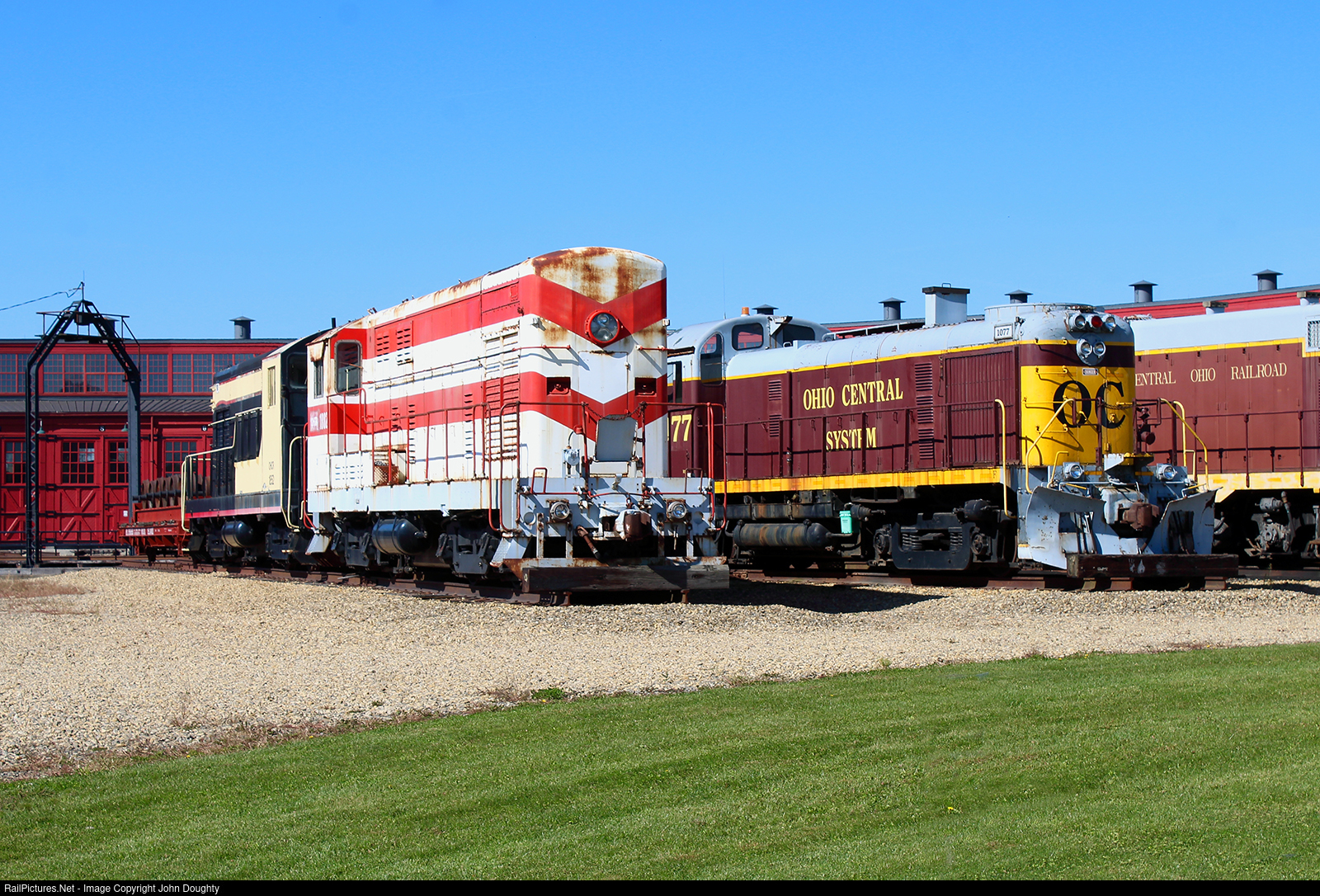 Ohio Central 1077 sits next to two Ohio Central Fairbank Morse H12-44 diesels, OC 1802 and OC 1852, at the Age of Steam Roundhouse Museum in Sugarcreek, Ohio. It is well worth the trip to see all the various steam and diesel locomotives at this beautiful museum.