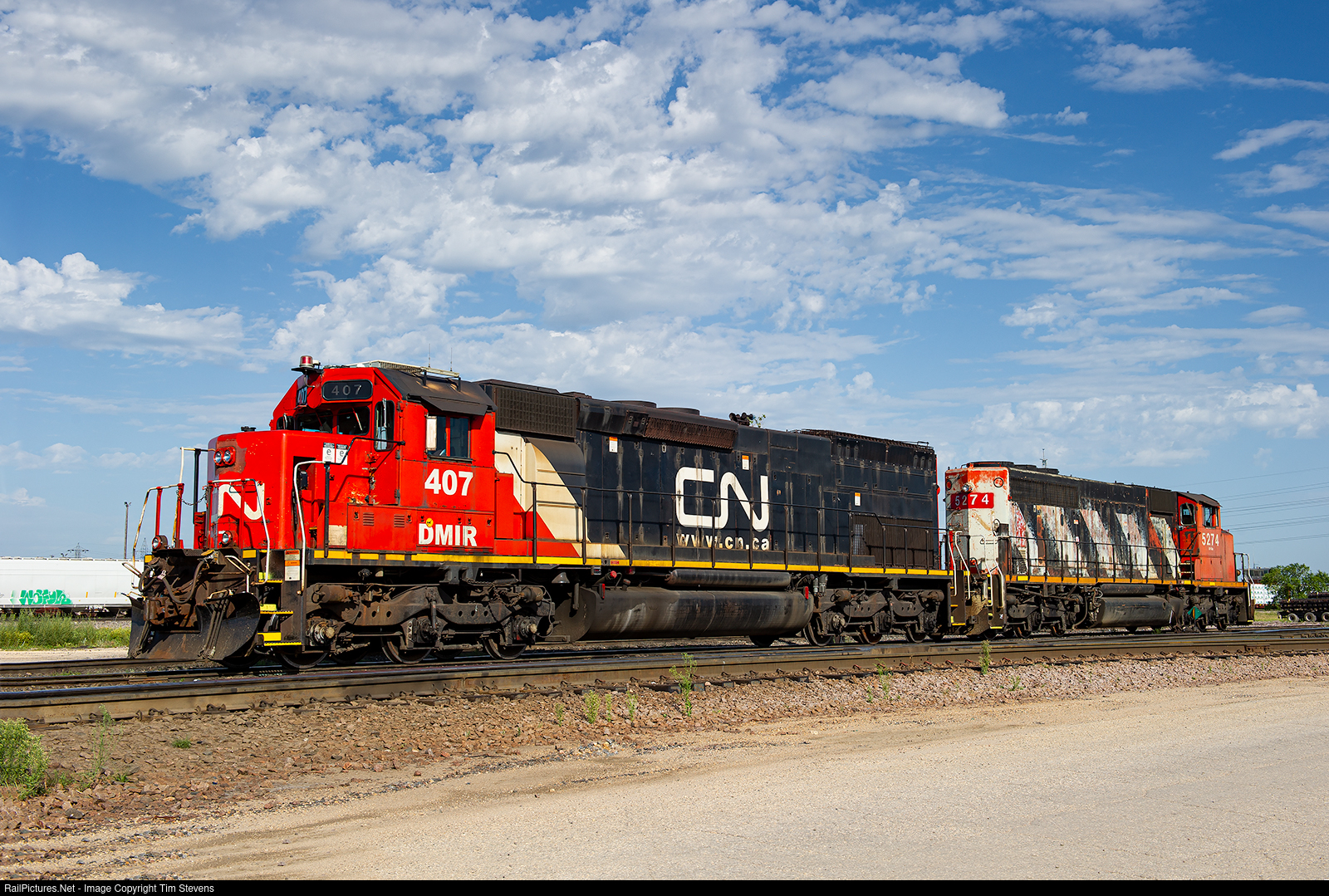 | DMIR SD40T-3 407 is starting to get pretty rough around the edges since its departure from its home shop at Proctor, MN. Here it is sitting idling between assignments at CN's Symington Yard in Winnipeg, MB. |