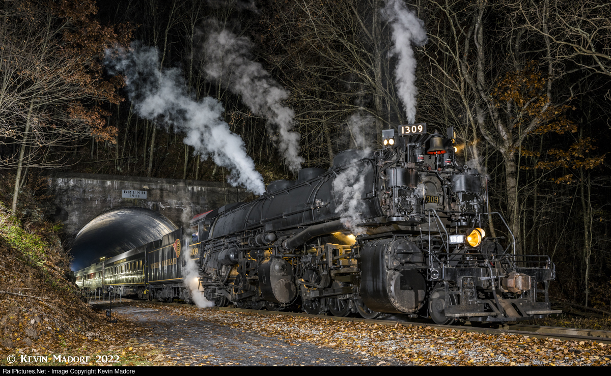 A trail-side portrait. Here's a trail-side portrait of the Western Maryland Scenic Railroad's recently restored Mallet Locomotive #1309, posing at the west portal of Brush Tunnel (MP 172.2). This night scene was arranged during a November, 2022 photo shoot organized by Trains Magazine. Although the primary shot that the organizers planned was on the non-trail side of the tunnel, there were a few opportunities to shoot this side as Photographer Casey Thomason was experimenting on the trail side as groups of participants were shifting positions on the other side. Although it includes the bike trail, I actually like this angle, because the trail lighting in the interior of the tunnel actually lights up the passenger consist inside. Although she is a C&O Locomotive, the big compound articulated looks great in the Western Maryland Fireball paint scheme. After several years of difficult times, it is great to see steam operating once again on the run from Cumberland to Frostburg, MD.