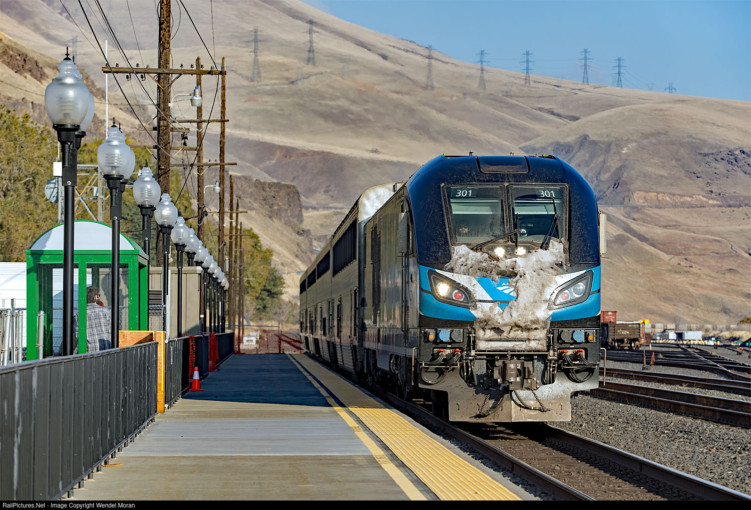 | Led by "Day 1” heritage unit 301, the Portland section of the Empire Builder rolls to a stop at Wishram. Running nearly six hours late, the train will likely reach its final stop at Union Station in Portland around sunset. |