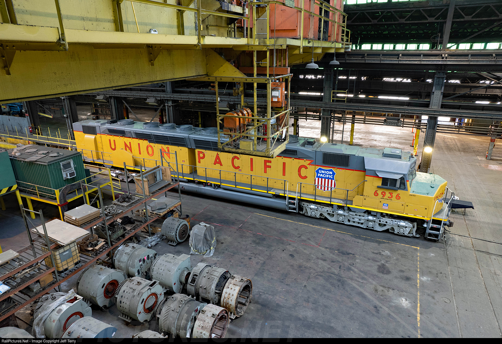 Right at Home Union Pacific "Centennial" DDA40X 6936 is spending its first morning inside its new home at the former Rock Island shops in Silvis, Illinois. The historic unit was formally donated the previous evening by Union Pacific to the non-profit Railroading Heritage of Midwest America. Visit rrhma.com for more info. Taken with permission.