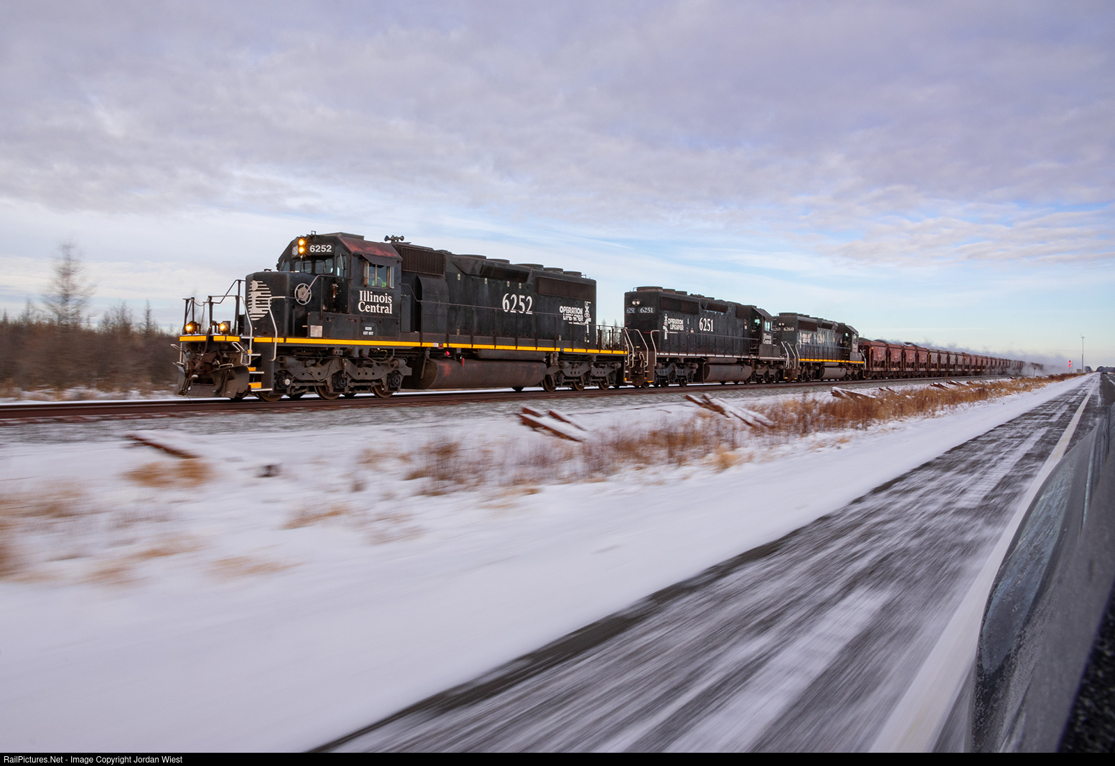A trio of Illinois Central SD40s bring fresh taconite pellets south on this frigid morning.