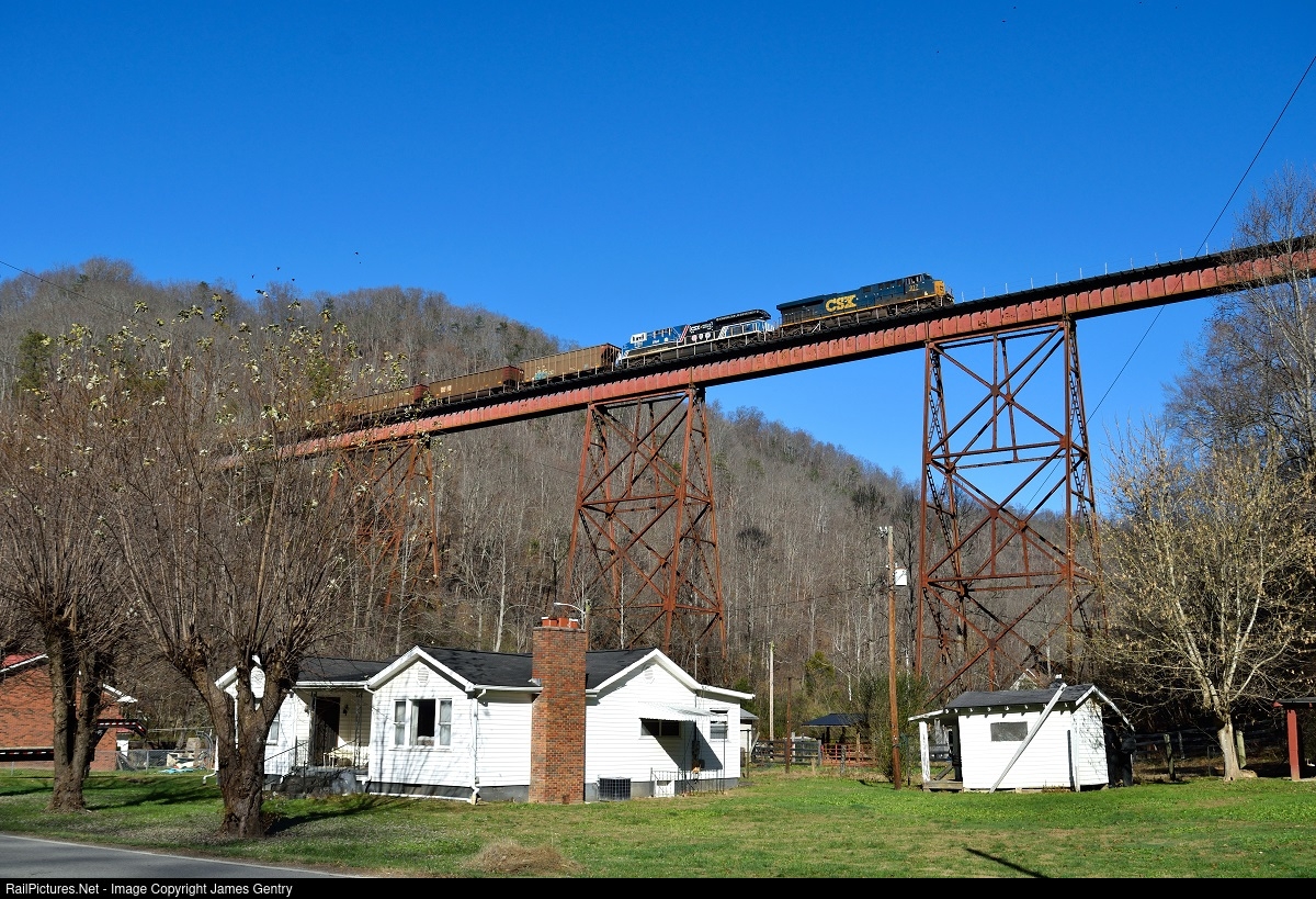 | On this picture perfect Thanksgiving Eve 2022, I managed to catch this empty coal train crossing Arnold Fork Viaduct along former C&O's E&BV Subdivision at Hall. And not to mention, CSX 3194, or famously known as Spirit of Law Enforcement can be seen trailing directly behind the lead. |