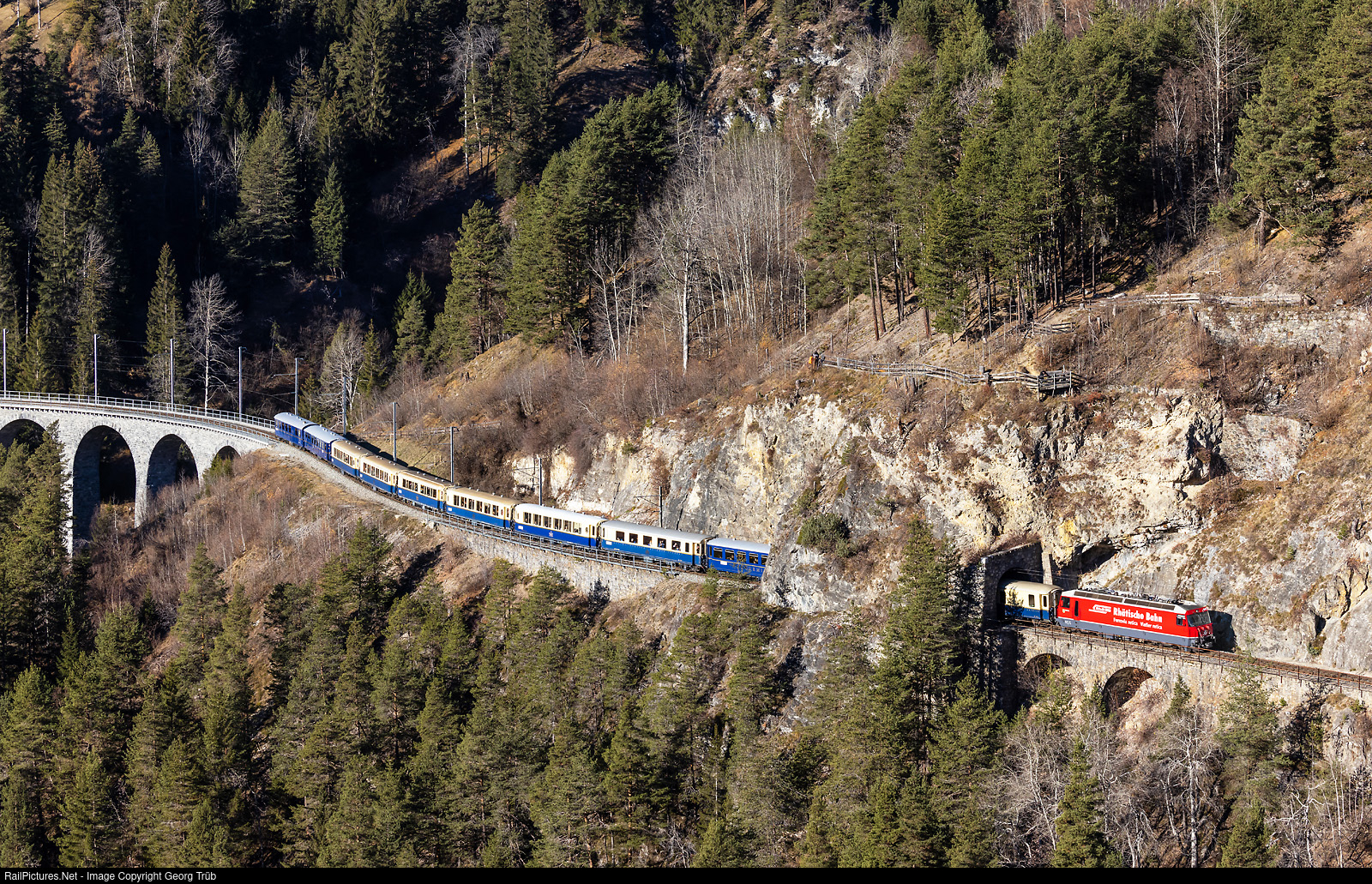 | Ge 4/4 III # 647 of the Rhaetian Railway is pulling the traditional Advent saloon cars journey of the association Pro Salonwagen through the 27 meter long Zalaint tunnel shortly before crossing the Landwasser viaduct. |