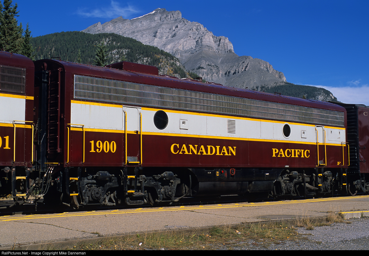 Canadian Pacific F9B No. 1900 is providing more power to a passenger train at Banff, Alberta, on October 1, 2010. The F9B looks very similar to a F7B, but unlike the earlier model, No. 1900 has the F9-era Farr stainless-steel vertical grills running along the roofline. Later railroad modifications include replacing the center porthole with a set of louvers to aid in engine room cooling.