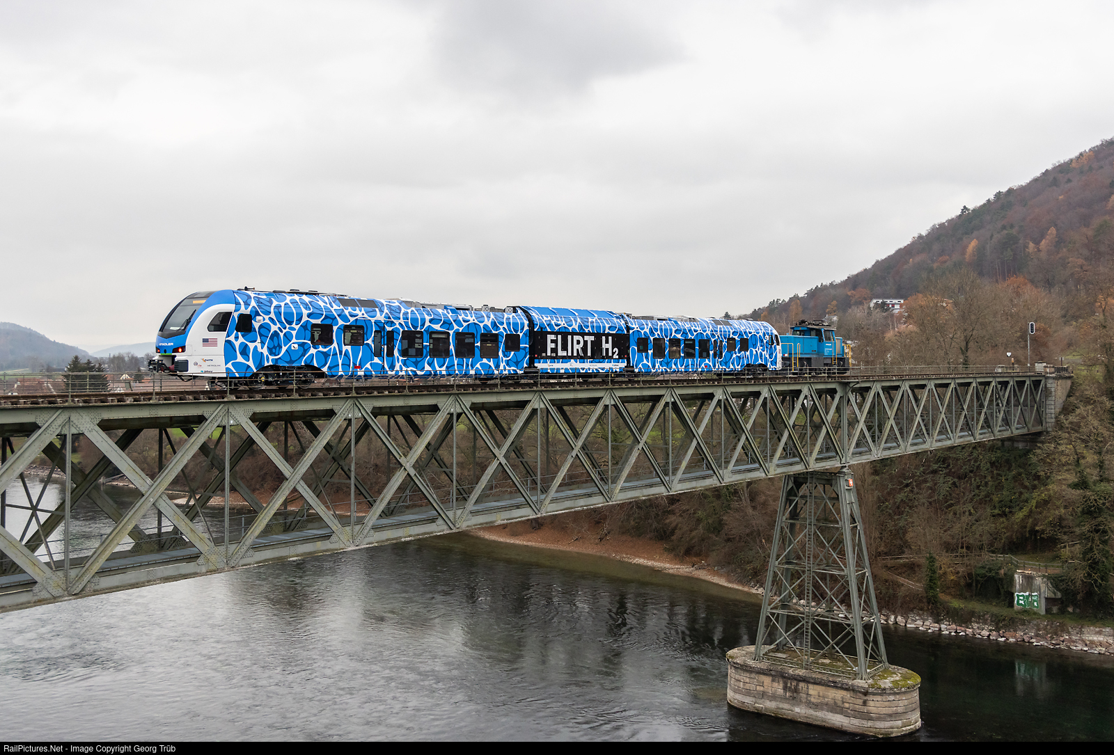 Electro/Battery locomotive Eea 936 # 133 of StadlerRail is pulling the new hydrogen Flirt "Flirt H2" for the californian Metrolink from Etzwilen over the Rhine bridge to Hemishofen. The new hydrogen powered train will make test runs on the former, never electrified, SBB line between Etzwilen and Singen, probably between Hemishofen and Ramsen. The line is now a museum railway line, owned by the foundation "Stiftung Museumsbahn Stein am Rhein – Etzwilen – Hemishofen – Ramsen & Rielasingen – Singen (SEHR & RS)". The train is destined for the Redlands Passenger Rail Project for the line between Redlands and San Bernardino. The power pack accommodates the entire hydrogen technology, from the fuel cells and batteries to the hydrogen tanks. This means that hydrogen technology is spatially clearly separated from the passenger compartments of the train. In November 2019, SBCTA (San Bernardino County Transit Authority) partnered with Stadler to design and build the first hydrogen-powered FLIRT.