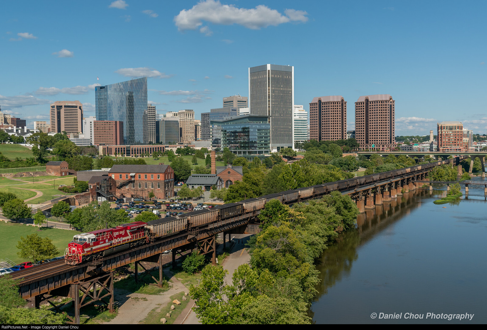 | CSXT 911, the First Responders unit is shoving hard on one of the few up-grade stretches of mainline east of Clifton Forge. The grade spans most of the famous trestle that covers the Richmond Sky-line, and while it is a steep grade - it's a lot simpler than the original routing the C&O used to come through Richmond. The original routing being a steep, tight route that went through Church Hill Tunnel - which collapsed on a train almost 100 years ago. |
