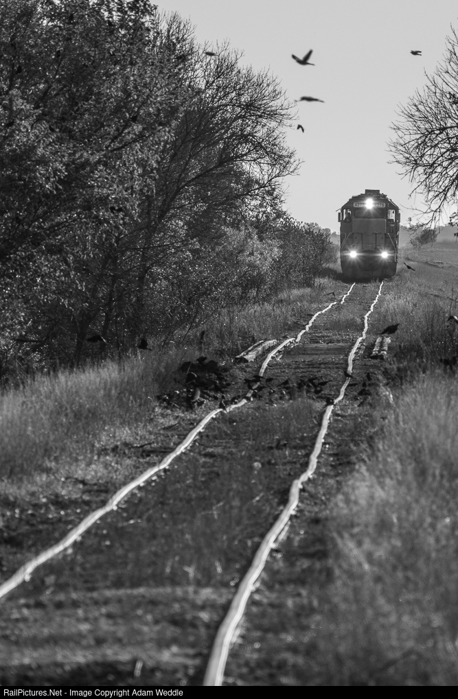 | It almost seems as though this Ringneck & Western crew should receive some hazard pay for running over these rails. They're currently tip toeing over old Milwaukee Road track that is typically out of service. The goal of this move is to retrieve 80 some former BN coal cars that have been sitting at the end of the line for a long time now. |