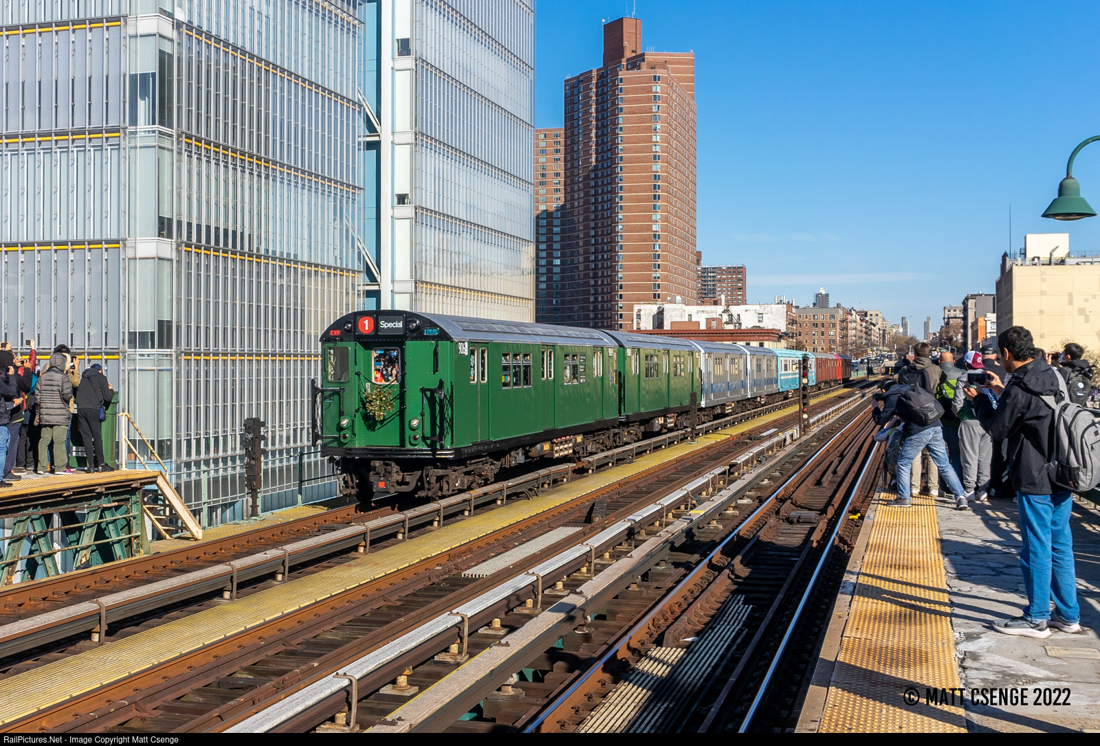 New York City Transit Authority (NYCTA) R33 no. 9069 (St. Louis Car Co., 1962-1963) is seen leading the "Train of Many Colors" into 125th St Station on the Broadway-7th Avenue Line. Typically the Holiday Train runs entirely underground, so the Manhattan Valley Viaduct and its station and portals were very popular locations for photographers! |