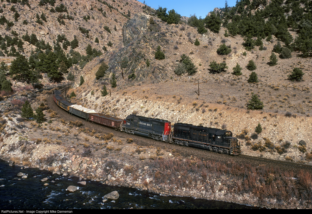 On January 9, 1998, Rio Grande GP40 No. 3075 and Cotton Belt GP40-2 No. 7291 power a five-car local of zinc concentrate along the Arkansas River through Browns Canyon, Colorado. For a year-and-a-half after Union Pacific closed Colorado’s Tennessee Pass as a through route on August 23, 1997, it still operated a one-a-week local from Pueblo to Malta, near Leadville, on a round trip that took two days.