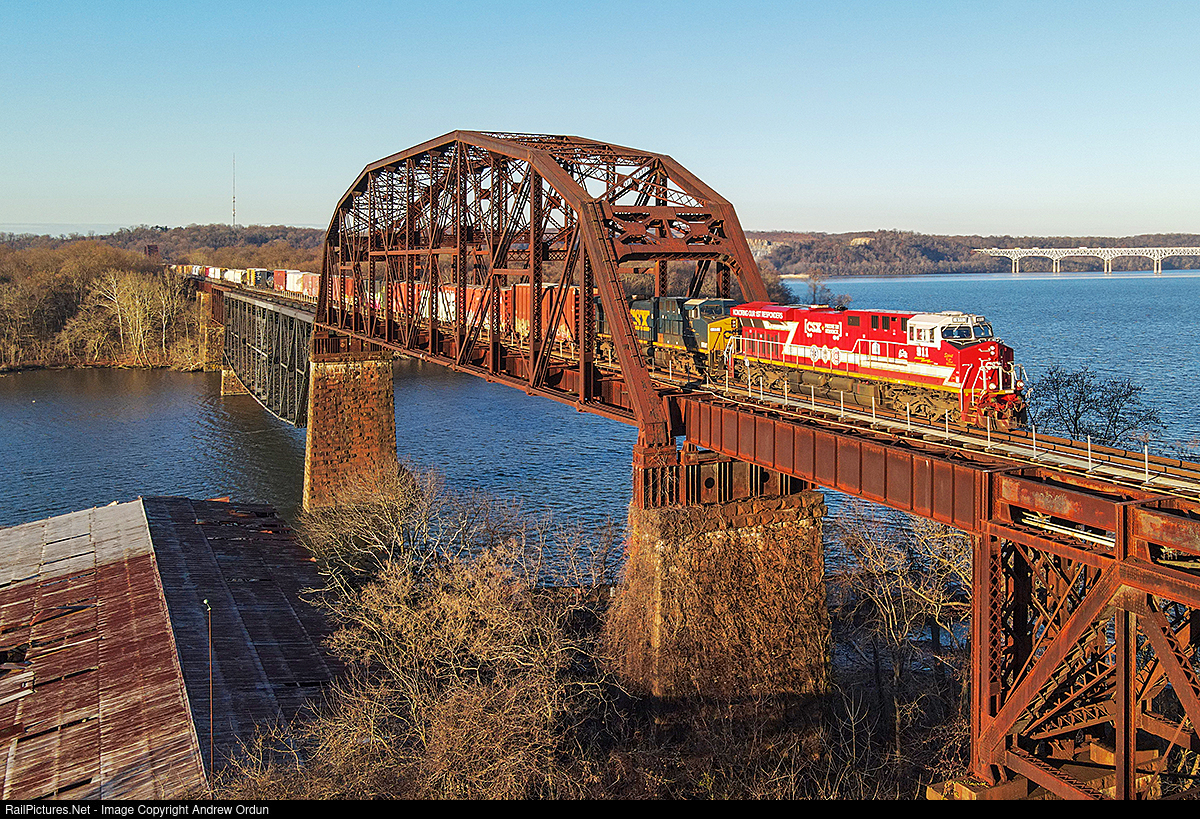 CSXT 911 leads M410-08 across the Susquehanna River bridge.