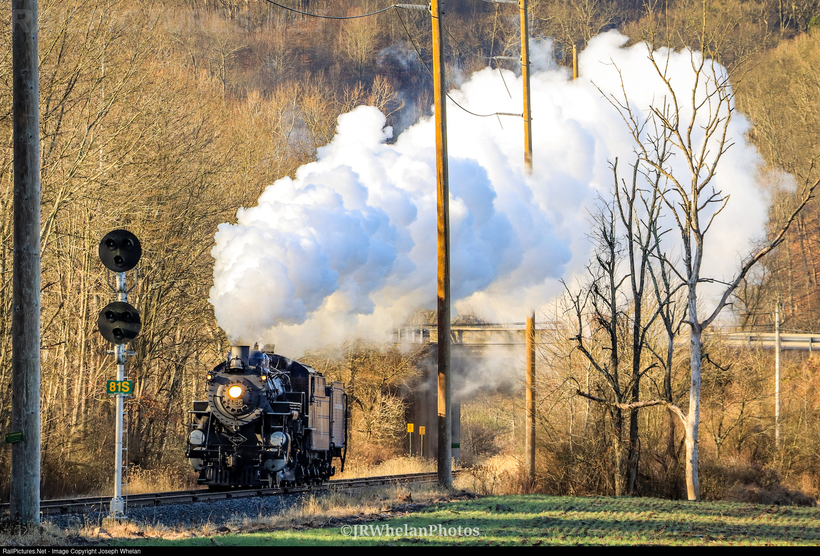 | Despite having no train behind her, Reading & Northern 425 creates a large plume with assistance from the cold temperatures. |