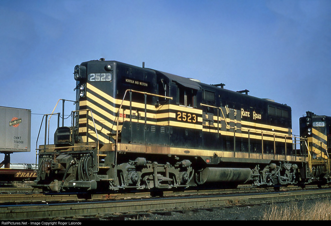 Former Nickel Plate Road GP9 523, renumbered by new owner Norfolk & Western at Madison, Illinois on November 19, 1966. Photo by John Booker, from my collection.