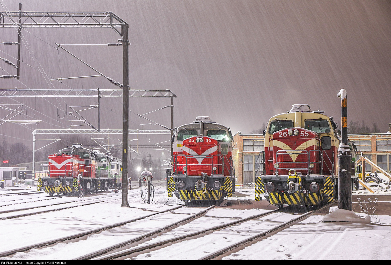 | Five VR Dv12 class diesel hydraulic locomotives waiting for their assignments as snow slowly falls over them. Dv12 is the most common diesel locomotive found on Finnish railway network with 192 built between 1963 and 1984, and with 41 retired currently! Sadly the era of these legendary diesels will come to an end in a few years as newer diesel locomotives take over and the number of electrified rail lines increases |