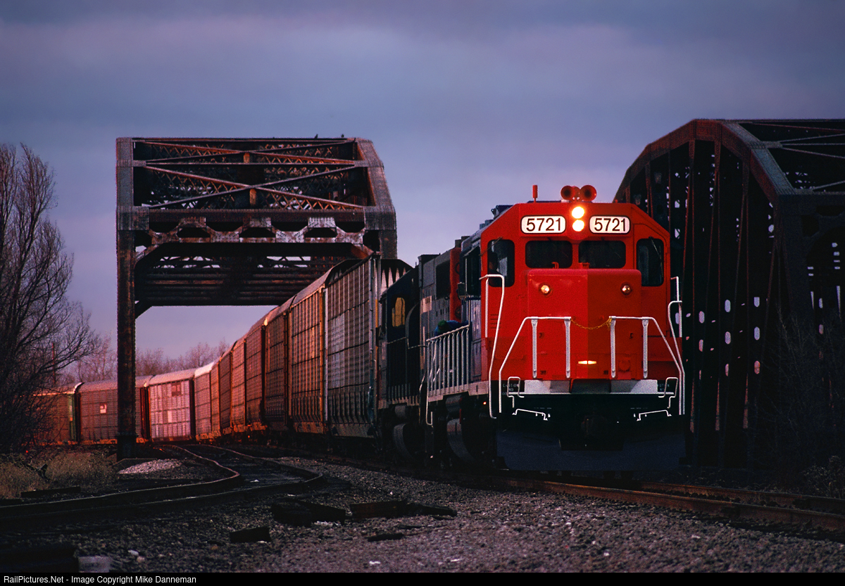 The last sunlight of December 3, 1988, lights up the autoracks on a Grand Trunk Western freight, led by freshly-painted GTW EMD GP38-2 No. 5721, at Blue Island, Illinois. The eastbound train is crossing one of the truss bridges over the Little Calumet River.