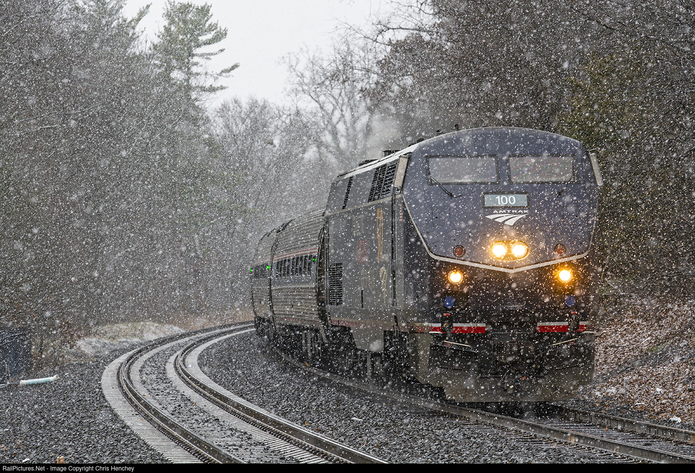 | Amtrak's Northbound Vermonter heads through the ever increasing snow on its way through Windsor towards Massachusetts and Vermont. One of Amtrak's 50th anniversary specially painted units is in charge of today's train, having replaced the electric unit at New Haven. |