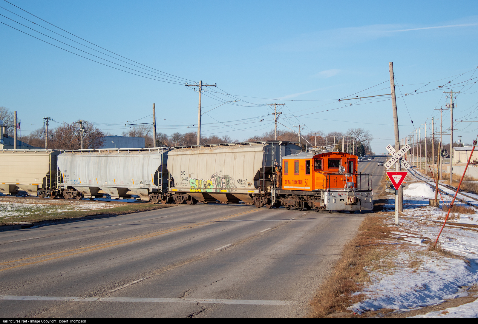 As the last interurban, Iowa Traction's operations are completely unique. Here, #51 crosses 19th Street to take four cars up to the CP interchange. On the back of the engine, the conductor is pulling the trolley pole down off of the wire while the train coasts through the intersection. This is likely because the wire in this section is not in good shape which could risk the pole coming off and snagging on the tension wires. While not captured here, there was large arching of the 600 volts between the wire and pole when it was brought down. Only on Iowa Traction can you see these ancient railroading practices.