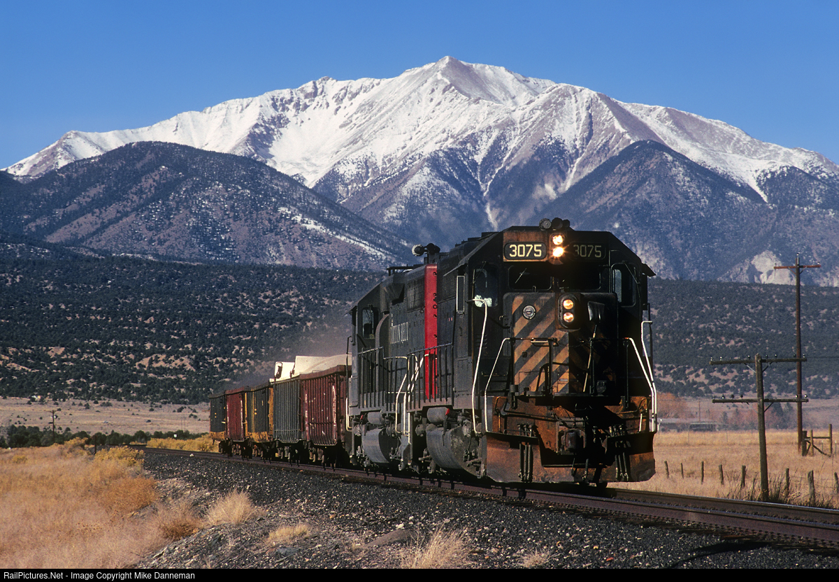 With 14,197-foot Mount Princeton towering in the background, Rio Grande GP40 No. 3075 and Cotton Belt GP40-2 No. 7291 power a five-car local of zinc concentrate between Brown Cañon siding and Salida, Colorado, on January 9, 1998. For a year-and-a-half after Union Pacific closed Colorado’s Tennessee Pass as a through route on August 23, 1997, it still operated a once-a-week local from Pueblo to Malta, near Leadville, on a round trip that took two days. Looks like they are losing some of the zinc ore out of the three gons without covers on this somewhat faster section of track approaching Salida.