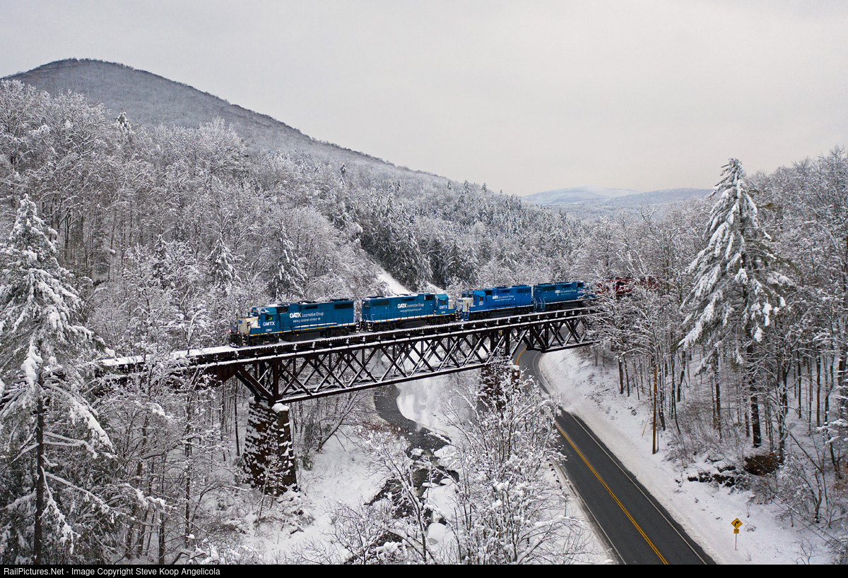 | Vermont Railway's GMRC 263 crosses the Cuttingsville Trestle the day after a December storm dumped up to 2 feet of snow over the area. With most of the railroad's newly painted red locomotives tied up in other service today was a GMTX blue day. |