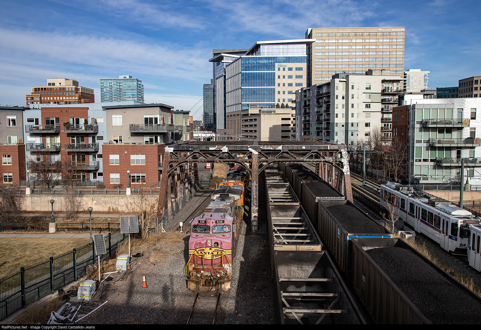 The hot Spokane, WA to Alliance, TX Q-train emerges out of Downtown Denver as it passes two tied down coal trains at LoDo. The Q-train, led by Warbonnet #636, is heading to Englewood for the crew change to keep traffic moving easier through Denver Yard.
