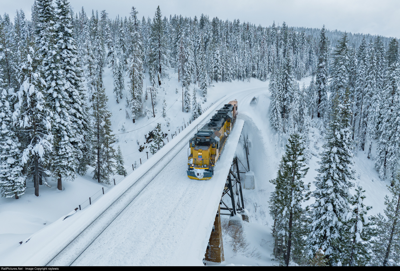UP 585 leads a flanger eastbound ahead of Amtrak 6 over the Lower Cascade Bridge near Troy, CA on Donner Pass.