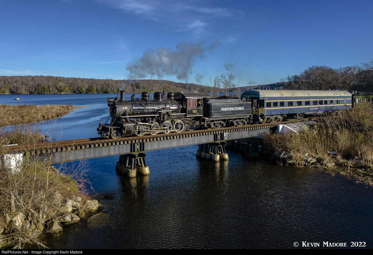Stepping out over Deep River Creek. Valley Railroad Consolidation #97 rumbles across the steel bridge over Deep River Creek as she hauls the 2PM North Pole Express toward North Chester, CT. Her train is the first of what will be 10 departures this day, utilizing 3, full-size steam locomotives, and three sets of heavyweight cars. Over the course of a month and a half, the Valley Railroad likely runs more steam-powered Christmas trains than any railroad in the country, with 7 departures scheduled Wednesday through Friday and 10 each day on Saturday and Sunday.