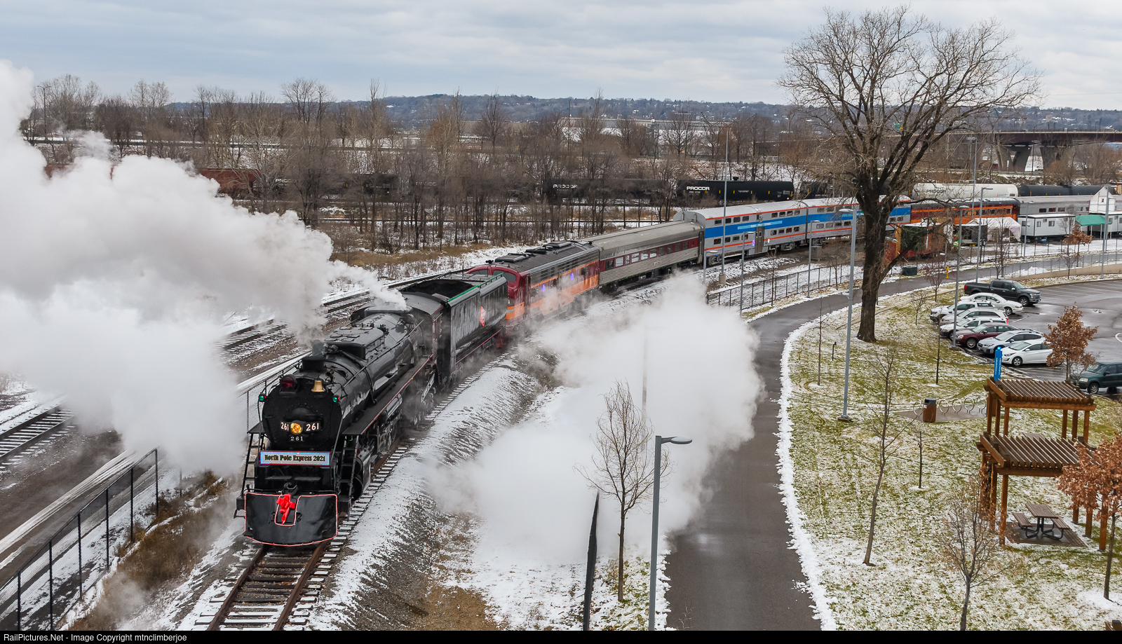 | The Friends of the 261 North Pull Express makes its short run down the tracks from the Saint Paul Union Depot to the "North Pole" set up just east of the station. In the lead is the Northern 4-8-4 Milwaukee Road 261, followed by the recently acquired Milwaukee Road E9A 32A. The train would make several trips back and forth throughout the day as part of the holiday festivities in Saint Paul, Minnesota. |
