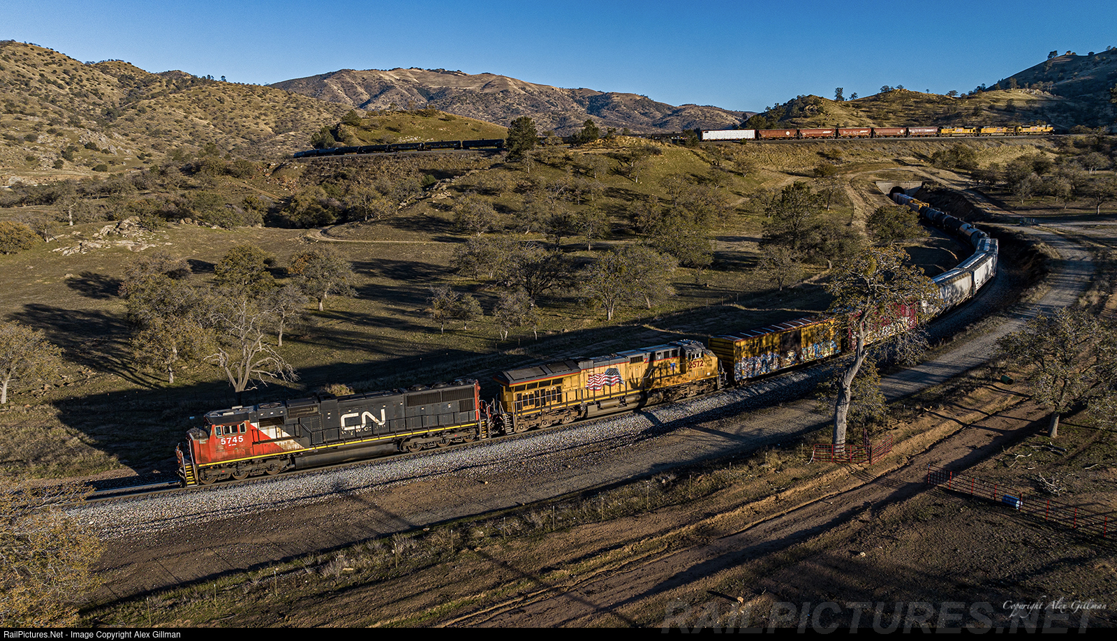 A Canadian Conquering The Loop. Canadian National No. 5745, an EMD SD75I built in 1997, is enjoying a warmer climate this winter as it shoves hard on the rear of a southbound Union Pacific manifest that has begun to cross over itself at the world-famous Tehachapi Loop.