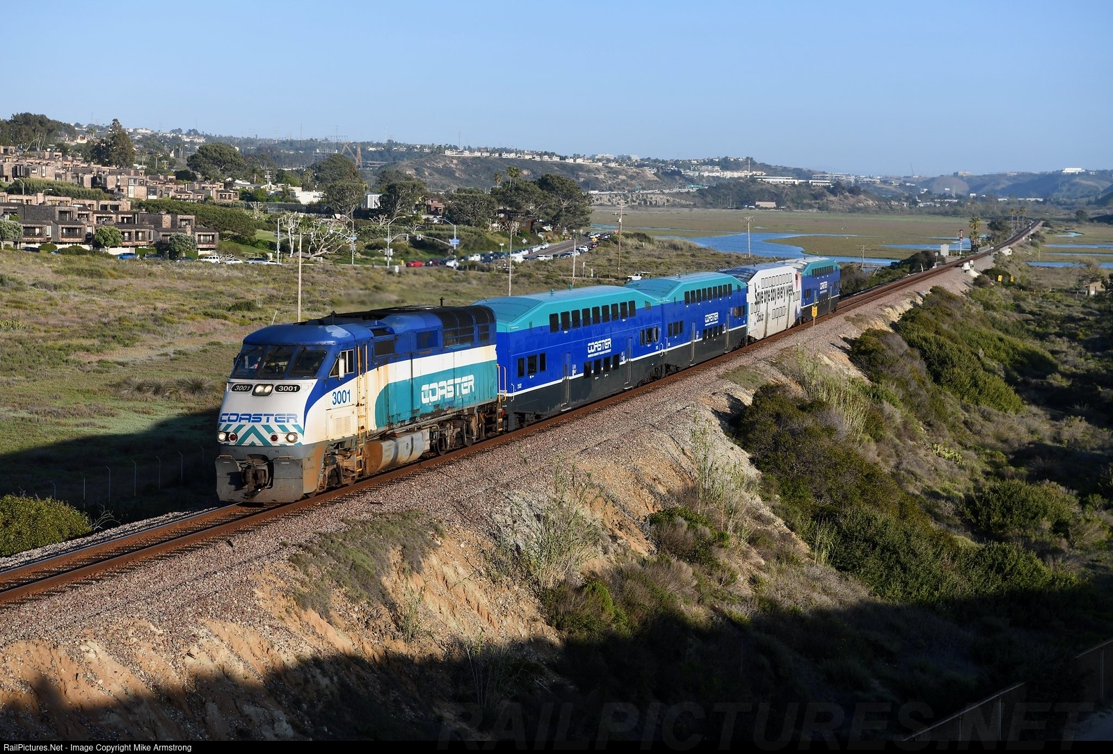 Coasting to the Finish Line: In the spring of 2022, Coaster 3001 was the only F59 locomotive in regular passenger service in Southern California. Even so, its operations in the golden state were limited. North County Transit District, which runs the Coaster commuter train service, began operating a 15 round trip per weekday schedule in 2021, requiring 5 train sets in service each day rather than the previous 4. As a result, all train sets were shortened from 5 to 4 cars in length. Having only two locomotives as backup, NCTD began regularly using an F59 locomotive on one of these sets, although use was limited to just two round trips per day on most days. In this scene from April of 2022, a well worn locomotive 3001 leads its train across the Los Peñasquitos Lagoon at the northern edge of the San Diego city limits. Soon enough, 3001 and sister 3002, which was mostly being used in non revenue service at this point, will be replaced by two new SC-44 Charger locomotives, built by Siemens-Mobility. NCTD approved the order in October of 2020 and the new locomotives are set to arrive in May of 2023 as of this writing.